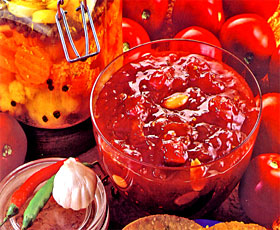 500 ग्राम पके कड़े टमाटर, 350 ग्राम शक्कर, एकचौथाई टी कप कतरी हुई गाजर, तीन कली छिले हुए लहसुन, 10-12 काली मिर्च, तीन लौंग, एक बड़ी इलायची, आधा इंच बारीक कटी अदरक, चार समूची लाल मिर्च, एक टीस्पून ग्लेसियल एसिटिक एसिड, आधा टीस्पून कलौंजी एक टीस्पून पिसी मिर्च, थोड़ा सा जायफल पाउडर, थोड़ा सा जावित्री पाउडर, दो टेबलस्पून छिले हुए बादाम, नमक स्वादानुसार।
