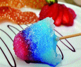 200 ग्राम क्रश की हुई बर्फ, 20 मिली. रोज सिरप, 20 मिली. ग्रेनेडिन सिरप, ब्ल्यू क्यूरेसो सिरप