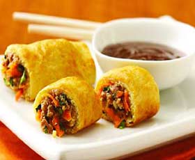 20 ग्राम भुनी और दरदरी की हुई मूंगफली, दो स्प्रिंग रोल शीट, 25 ग्राम बंदगोभी, 10 ग्राम गाजर, 10 ग्राम हरी शिमला मिर्च, 10 ग्राम लाल शिमला मिर्च, 10 ग्राम पीली शिमला मिर्च, 1/2 टीस्पून सोया सॉस, 1/2 टीस्पून विनेगर, 1/2 टीस्पून चिली सॉस, स्वादानुसार नमक व कालीमिर्च पाउडर, दो टेबलस्पून तेल।